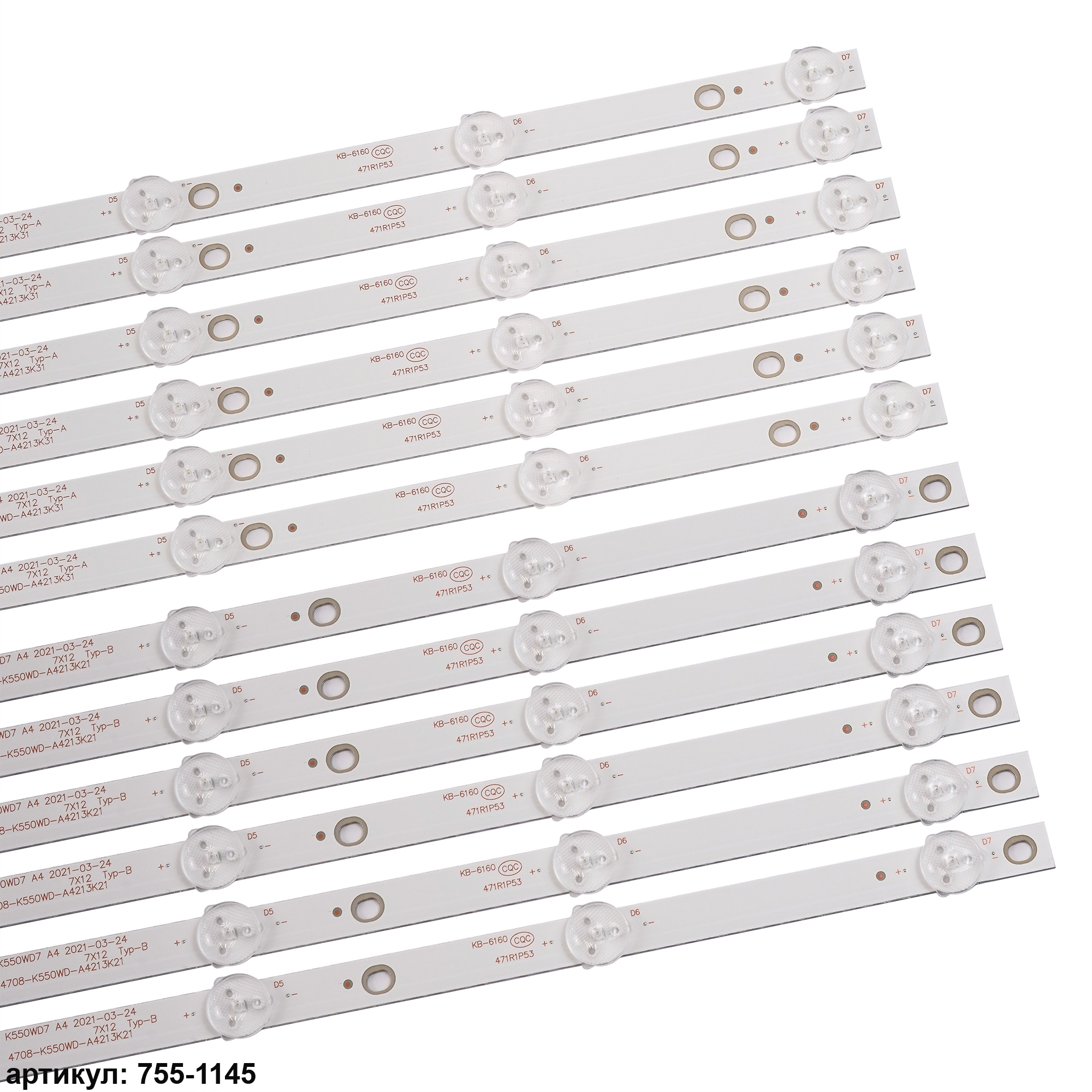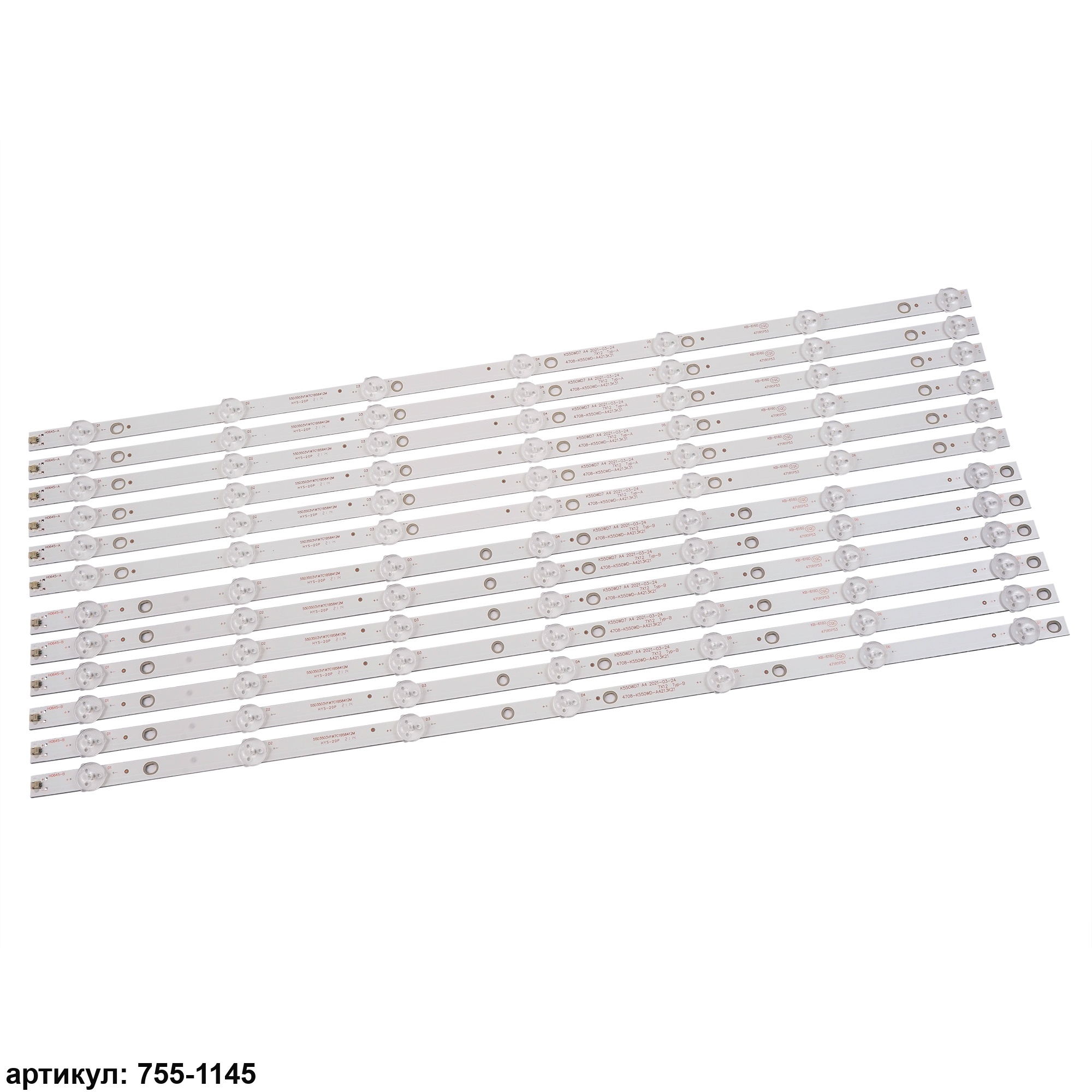Комплект планок светодиодной подсветки для телевизора Philips 55' / (7 led 3V 584mm)Комплект включает в себя:- 6 планок 4708-K550WD-A4213K31 type a- 6 планок 4708-K550WD-A4213K21 type bСовместимые p/n: 4708-K550WD-A4213K31, 4708-K550WD-A4213K21, K550WD7 A4Подходит для моделей телевизора: Philips 55PFF5250/ T3, 55PUF6056, 55PFF5250, 55PFF5055, 55PUF6051