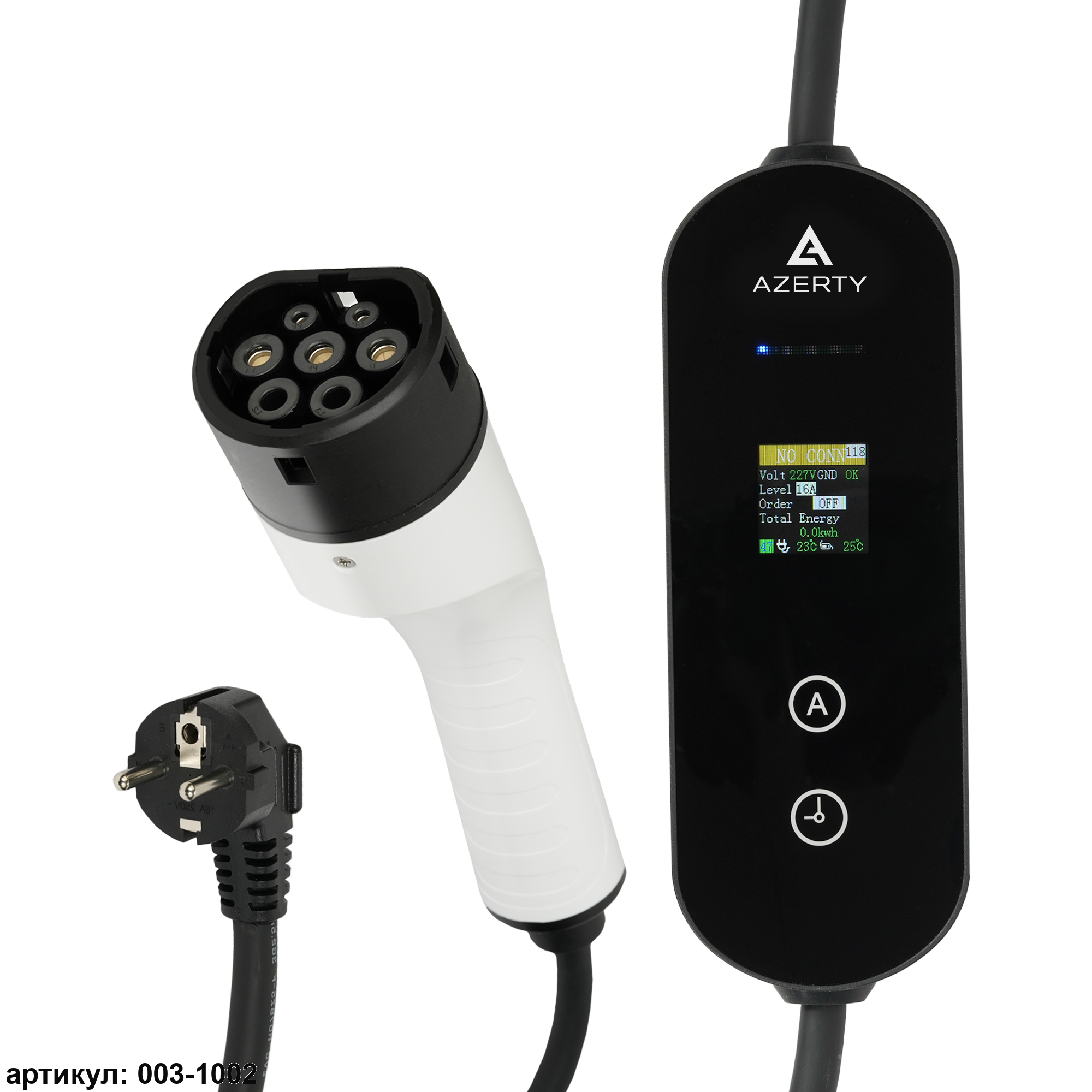 Мобильное зарядное устройство для электромобиля Azerty PN-1605AB удобно для транспортировки в багажнике автомобиля, так как имеет отдельную сумку-чехол и не занимает много места. Устройство предлагается в двух версиях с двумя отличными вариантами разъема. Разъем Type 2 (артикул: 003-1002) совместим с большинством европейских марок, а разъем GB/T (артикул: 003-1001) с большинством китайских марок. Максимальная мощность  зарядного устройства 3,5 кВт с возможностью регулировки силы тока и времени заряда. Прочный и долговечный кабель имеет длину 5 метров, этого достаточно для большинства гаражей и подъездов. Зарядная станция для электромобиля имеет степень пыле- и влагозащиты IP65, а также надежно работает в широком диапазоне температур от -30 °C до +55 °C, поэтому подходит для использования на улице под навесом или в гараже, обеспечивая стабильную зарядку в таких непростых условиях.Зарядное устройство для электромобиля оснащено рядом защитных функций: - Защита от перегрева: устройство автоматически отключится при температуре выше 85°C, предотвращая перегрев; - Защита от перенапряжения: обеспечивает стабильную работу при колебаниях напряжения в сети; - Защита от низкого напряжения: устройство отключается при падении напряжения ниже безопасного уровня; - Защита от утечки электричества: система моментально реагирует на утечки и предотвращает возможные опасности.