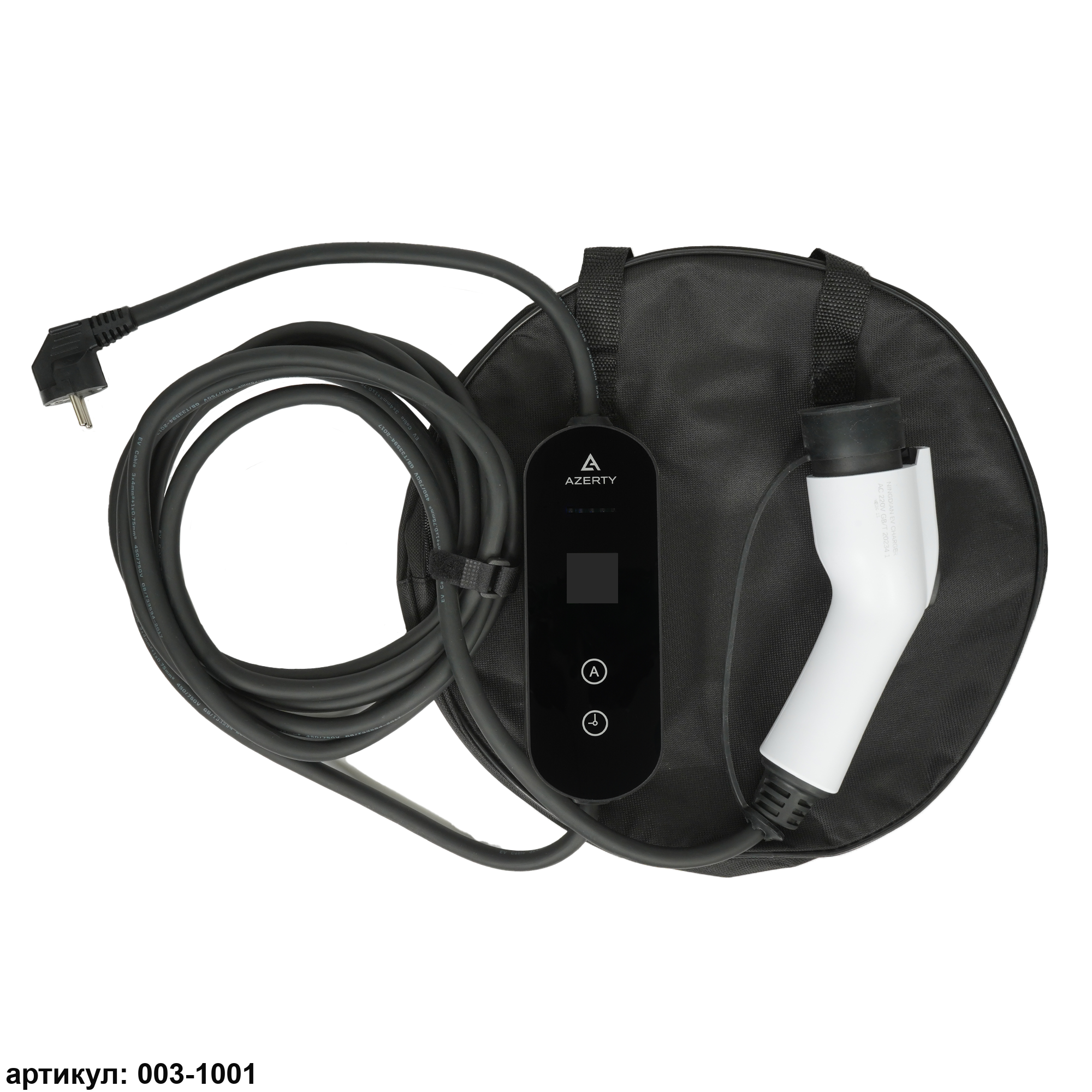 Мобильное зарядное устройство для электромобиля Azerty PN-1605AB удобно для транспортировки в багажнике автомобиля, так как имеет отдельную сумку-чехол и не занимает много места. Устройство предлагается в двух версиях с двумя отличными вариантами разъема. Разъем Type 2 (артикул: 003-1002) совместим с большинством европейских марок, а разъем GB/T (артикул: 003-1001) с большинством китайских марок. Максимальная мощность  зарядного устройства 3,5 кВт с возможностью регулировки силы тока и времени заряда. Прочный и долговечный кабель имеет длину 5 метров, этого достаточно для большинства гаражей и подъездов. Зарядная станция для электромобиля имеет степень пыле- и влагозащиты IP65, а также надежно работает в широком диапазоне температур от -30 °C до +55 °C, поэтому подходит для использования на улице под навесом или в гараже, обеспечивая стабильную зарядку в таких непростых условиях.Зарядное устройство для электромобиля оснащено рядом защитных функций: - Защита от перегрева: устройство автоматически отключится при температуре выше 85°C, предотвращая перегрев; - Защита от перенапряжения: обеспечивает стабильную работу при колебаниях напряжения в сети; - Защита от низкого напряжения: устройство отключается при падении напряжения ниже безопасного уровня; - Защита от утечки электричества: система моментально реагирует на утечки и предотвращает возможные опасности.