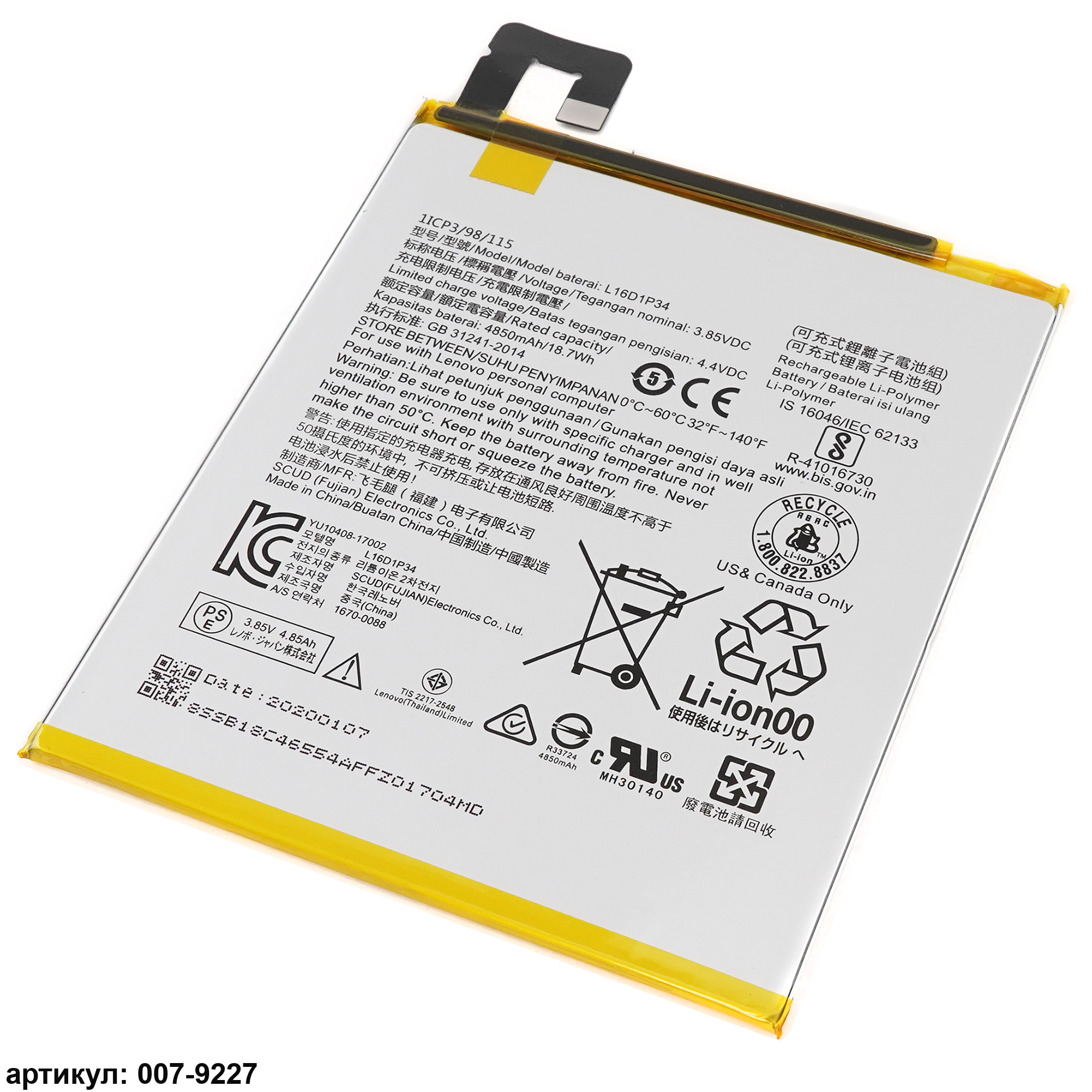 Подходит к планшетам: Lenovo Tab 4 8', Tab 4 8' Plus, Tab 4 TB-8504F, Tab 4 TB-8504F 8', Tab 4 TB-8504F 8' PlusСовместимые P/n: L16D1P34, SB18C15125, SB18C15126, YU10624-17002