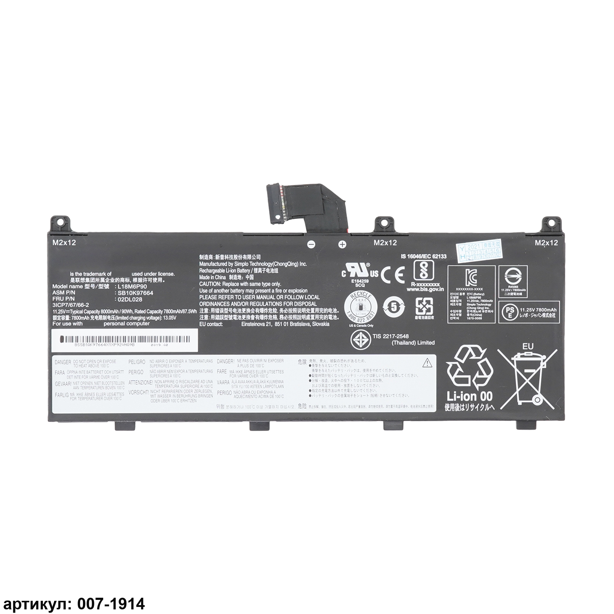 Подходит к сериям ноутбуков: Lenovo ThinkPad P53Совместимые P/N: L18M6P90, 02DL029, 5B10W13902, 02DL028, 5B10W13901