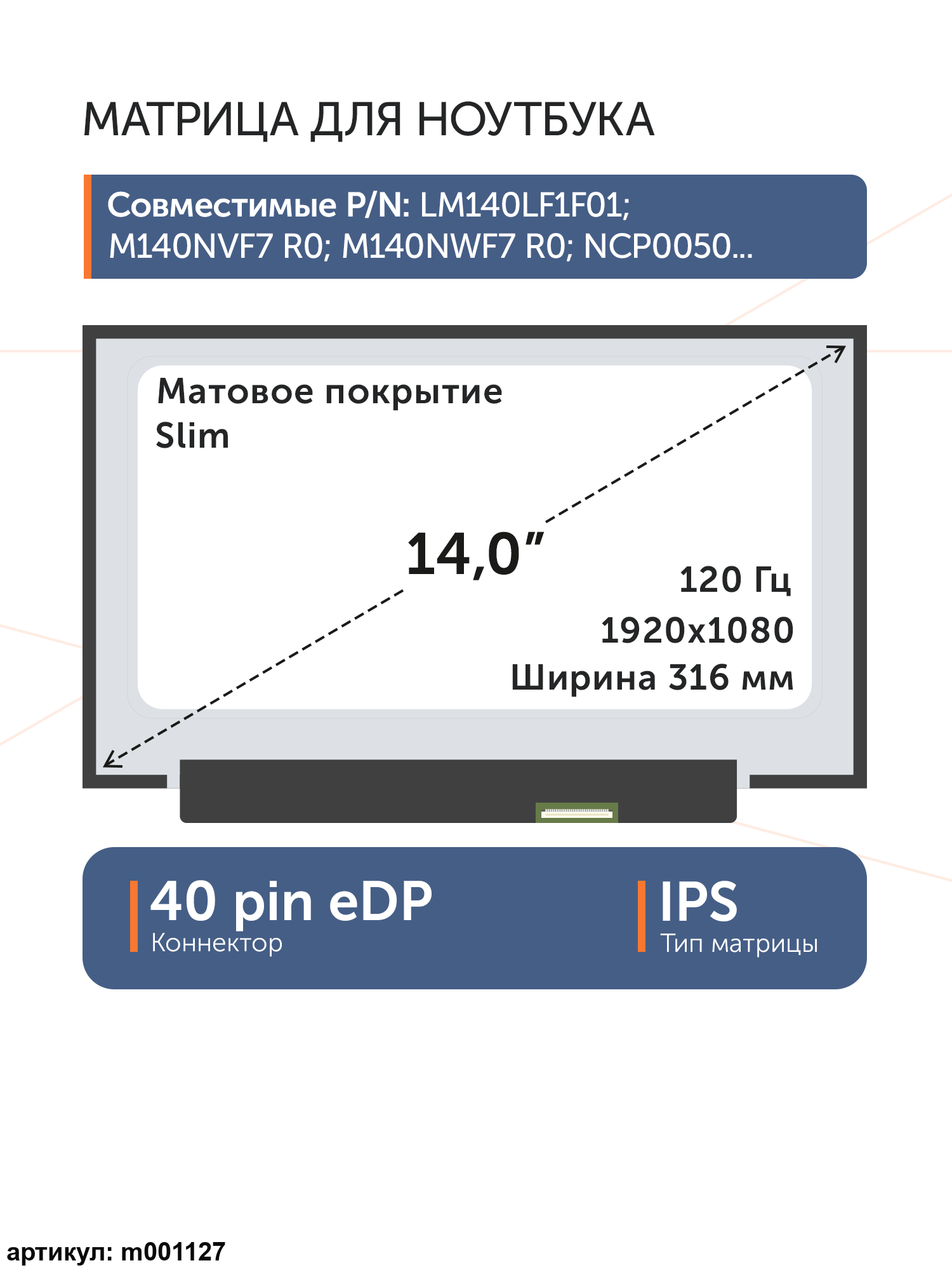 Матрица тонкая (Slim), без креплений.Разъем расположен снизу справа на внешней плате.Тип матрицы: ADSPN: LM140LF1F01, LQ140M1JW46, M140NVF7 R0Ширина: 316мм