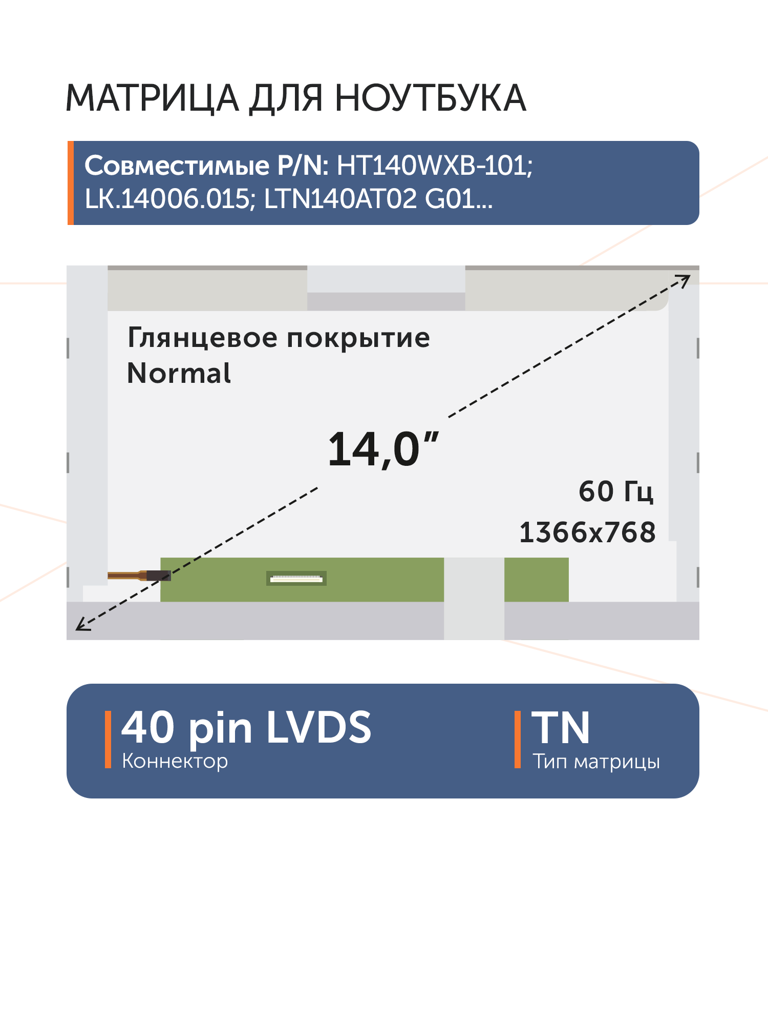 Совместимые модели: HT140WXB-601, NT140WHM-N14, LP140WH1(TL)(A3), B140XW01 v.C, N140BGE-L23 Rev.C1, HT140WXB-101, HT140WXB-100, LP140WH4(TL)(P2), LP140WH4(TL)(P1), N140BGE-L13, LTN140AT16 B01, B140XW01 v.B, LP140WH4(TL)(N2), B140XTN01.3, HB140WX1-200, N140BGE-L23, HSD140PHW3 B00, BT140GW01 v.6, M140NWR2 R2, LP140WH4(TL)(N1), BT140GW01 v.5, BT140GW01 v.0, M140NWR2 R1, BT140GW02 v.5, BT140GW02 v.0, HB140WX1-100, LTN140AT25, LTN140AT24, LTN140AT23, LTN140AT19 201, LTN140AT18 201, LP140WH4(TL)(A2), LTN140AT16, LP140WH5(TL)(Z1), N140BGE-L12, LTN140AT26, N140BGE-L22, LTN140AT22, HT140WXB-501, LP140WH4(TL)(C1), BT140GW01 v.2, N140B6-L01, LP140WH1(TL)(B3), CLAA140WB11A, BT140GW01 v.9, LP140WH4(TL)(B1), LP140WH4(TL)(A1), LTN140AT04 G01, LTN140AT07-L01, HSD140PHW1 A, LTN140AT04, LTN140AT02, LTN140AT01, N140BGE-L21, N140BGE-L11, N140B6-L08, N140B6-L02, LTN140AT07, LP140WH1(TL)(E3), LP140WH1(TL)(E2), LP140WH1(TL)(D6), LP140WH1(TL)(D3), LP140WH1(TL)(C6), LP140WH1(TL)(B1), LP140WH1(TL)(C3), LP140WH1(TL)(A4), LP140WH1(TL)(A2), LP140WH1(TL)(A1), B140XW01 v.9, B140XW01 v.8, B140XW01 v.7, B140XW01 v.6, B140XW01 v.1, B140XW01 v.0, LTN140AT26-L01
