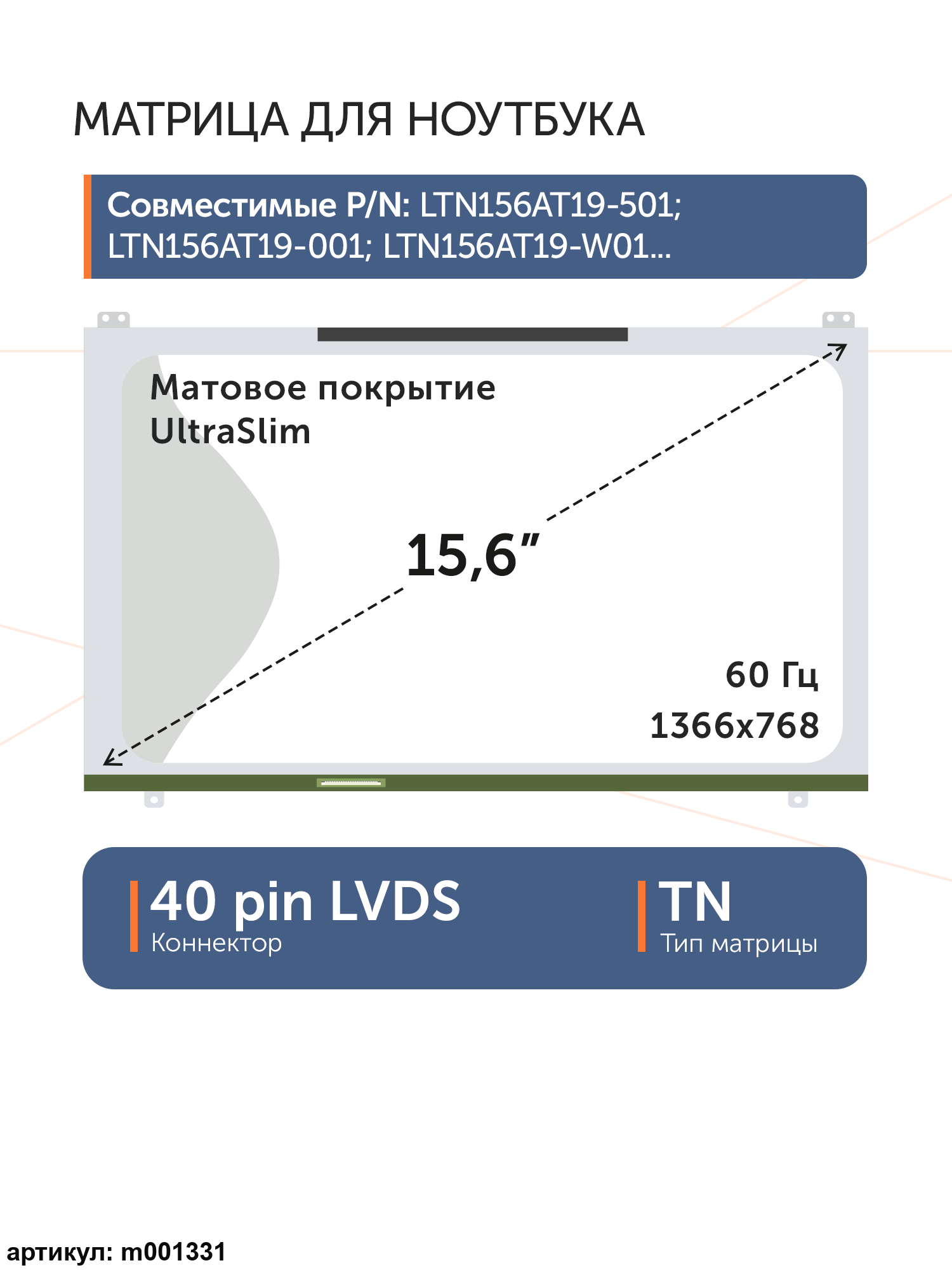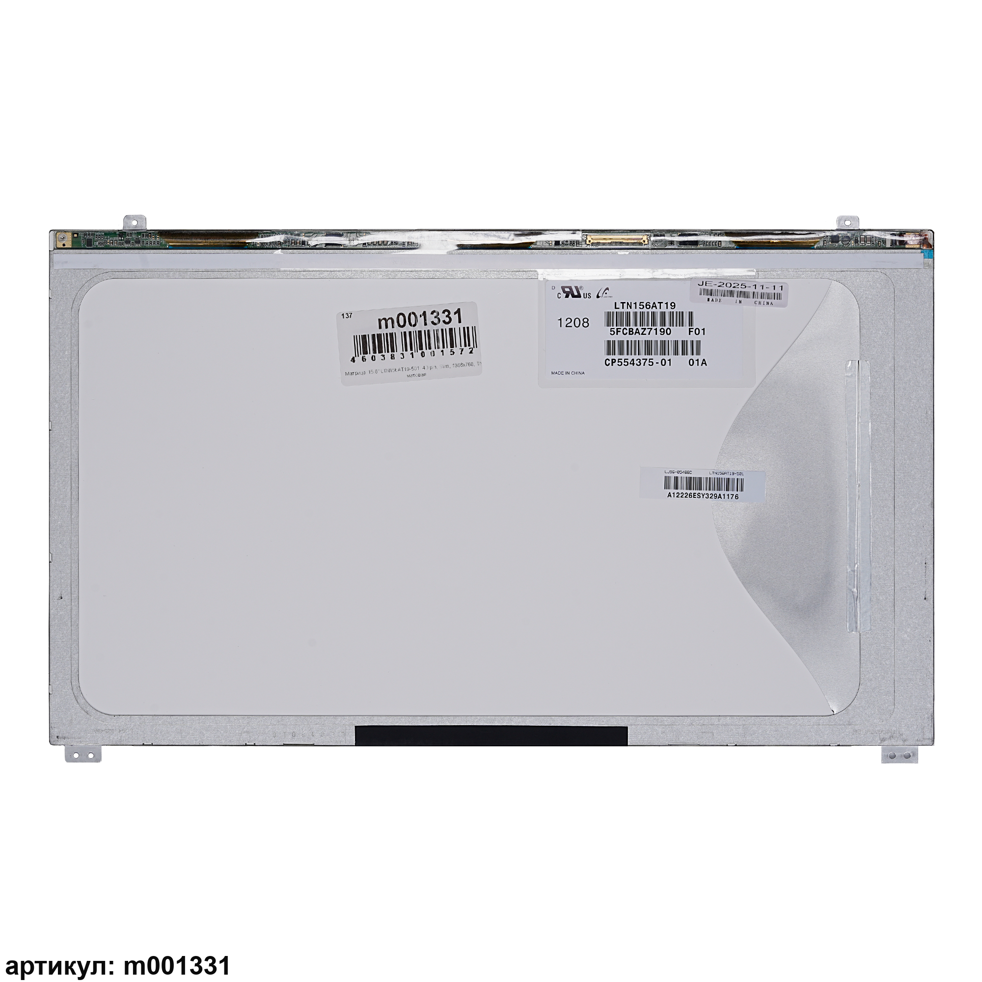 Матрица тонкая (UltraSlim), крепление (ушки) расположены сверху и снизуРазъем расположен внизу слева на внешней плате.Совместимые модели: LTN156AT19, LTN156AT19-503, LTN156AT19-001, N156BGE-L51, N156BGE-L62, N156BGE-L52, LTN156AT18