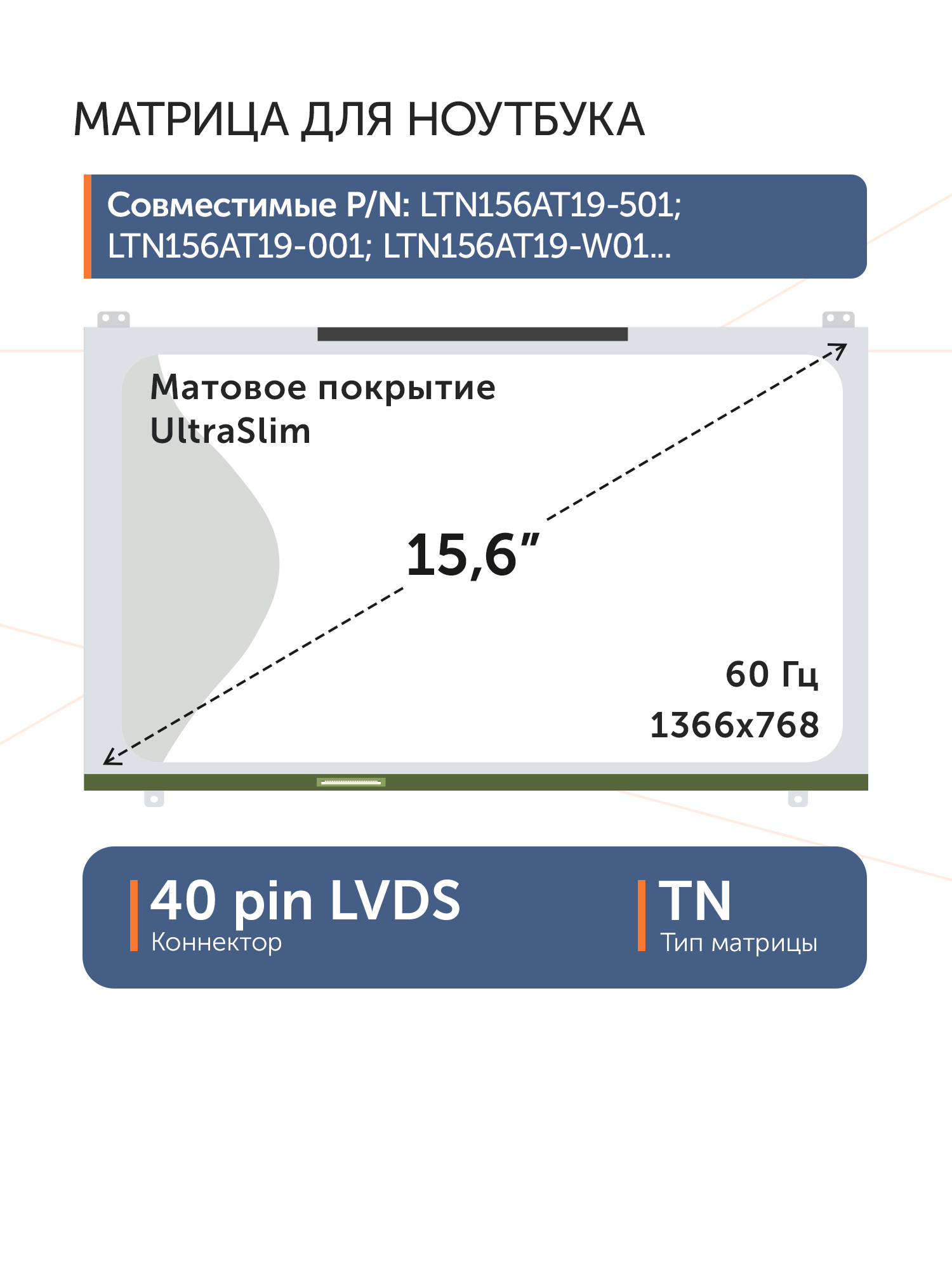Совместимые модели: LTN156AT19, LTN156AT19-503, LTN156AT19-001, N156BGE-L51, N156BGE-L62, N156BGE-L52, LTN156AT18