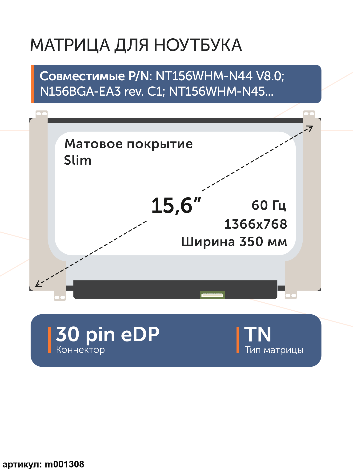 Совместимые модели: NT156WHM-N44, N156BGA-EA3 Rev.C3, N156BGA-EA3 Rev.C2, NT156WHM-N34, N156BGA-EB3, NT156WHM-N49, NT156WHM-N30, NT156WHM-N40, B156XTN08.0, B156XTN08.1, MB156AN01-3, NT156WHM-N35, NT156WHM-N44 V8.0, NT156WHM-N48