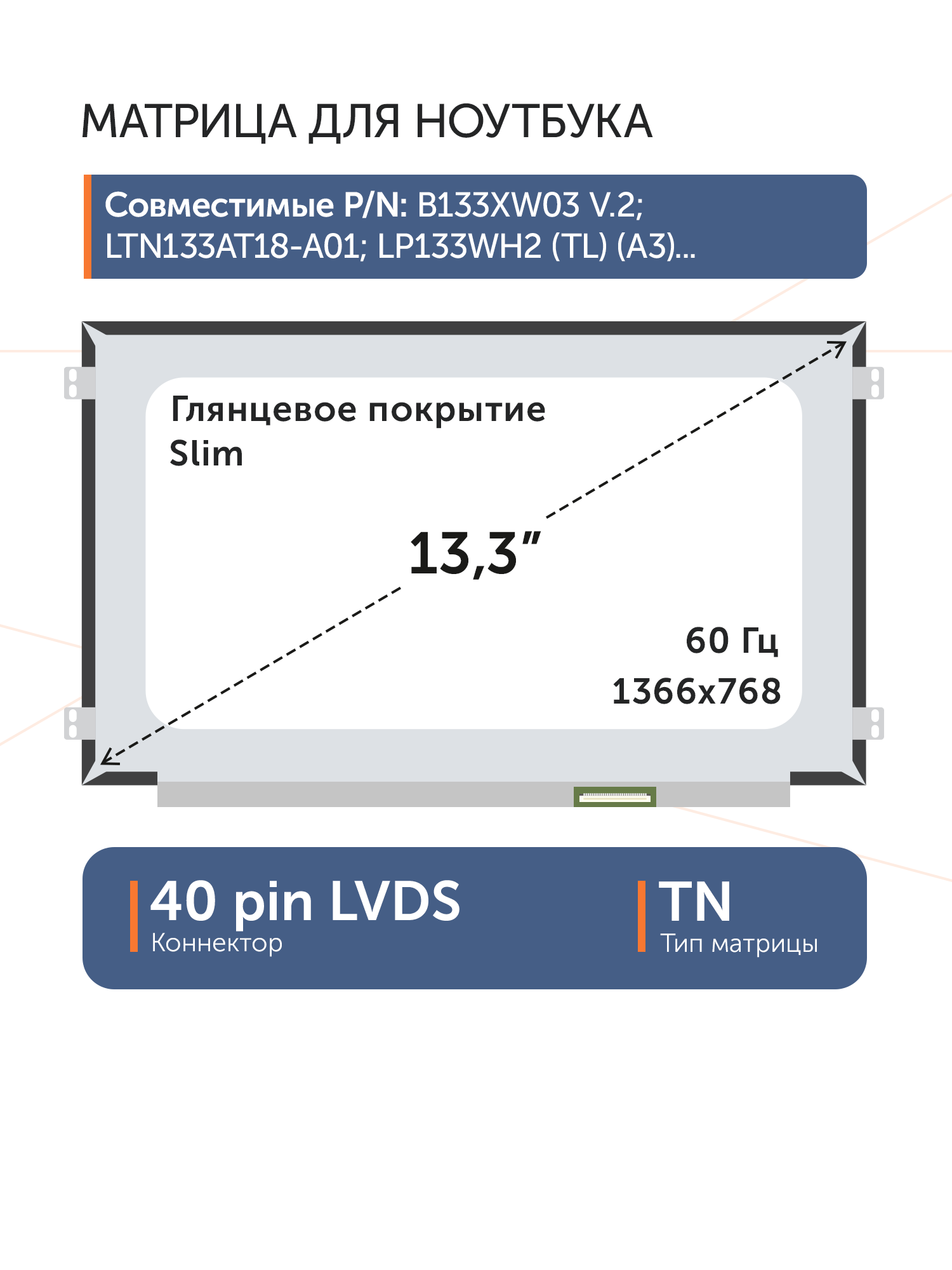 Совместимые модели: B133XW01 V.2, B133XW01 V.3, B133XW01 V.7, B133XW03 V.2, LTN133AT18-A01, LP133WH2 (TL)(A3), LP133WH2 (TL)(A4), LP133WH2 (TL)(L1), LP133WH2 (TL)(M1), LT133EE09300, N133BGE-LB1 Rev.C2, N133BGE-LB1 Rev.C1, B133XW03 V.4, LP133WH2-TLA3, LP133WH2-TLA4, LP133WH2-TLL1, LP133WH2-TLM1, B133XW03 V.3
