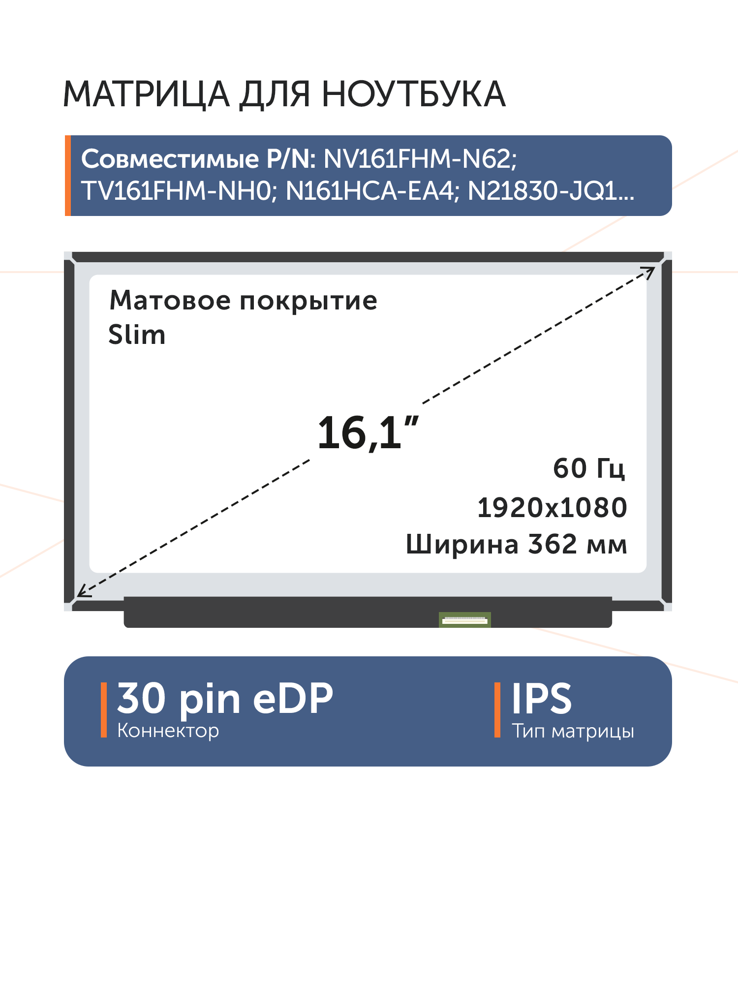 Матрица тонкая (slim), без креплений.Разъем расположен снизу справа на внешней плате.Совместимые модели: N161HCA-EA2, N161HCA-EA3, N161HCA-EAC, NV161FHM-N41, NV161FHM-N61, TV161FHM-NH0