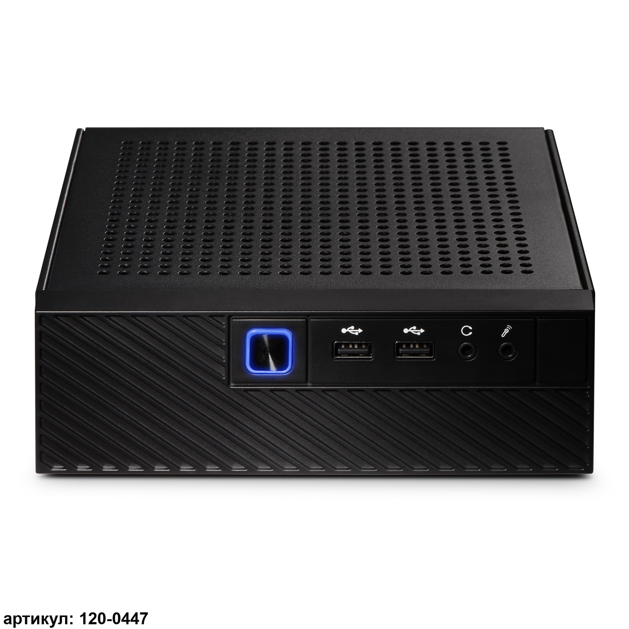 • Корпус из металла с перфорацией на боковых панелях для улучшения теплоотвода, на фронтальной части которого предусмотрены USB-порты и аудио-разъемы, что повышает его функциональность.
