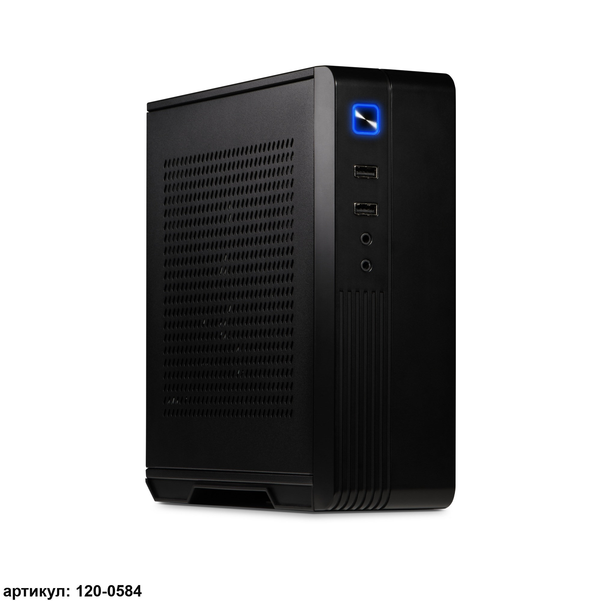 • Компактный корпус можно ориентировать как вертикально, так и горизонтально. Он выполнен из металла и пластика чёрного цвета. На передней панели в легком доступе расположены разъемы USB, а также разъемы для подключения наушников и микрофона. Перфорированная боковая панель обеспечивает отличную циркуляцию воздуха, способствующую охлаждению компонентов.