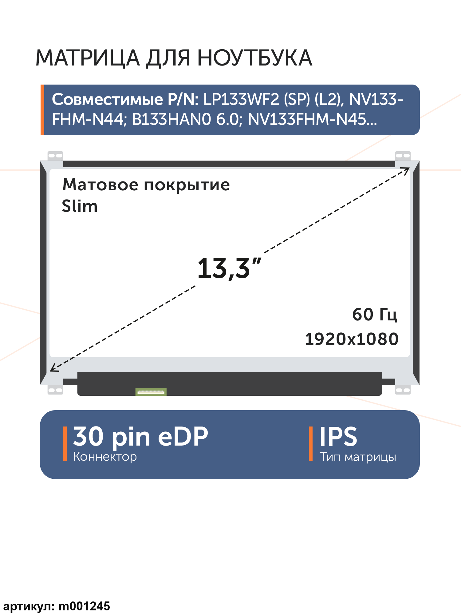 Совместимые модели: LP133WF2 (SP)(L2), NV133FHM-N44, B133HAN06.0, NV133FHM-N45, NV133FHM-N44, N133HCE-EAA Rev. B2, NV133FHM-N43